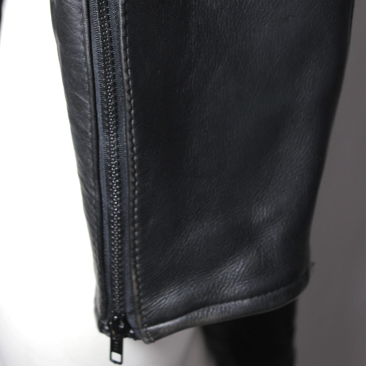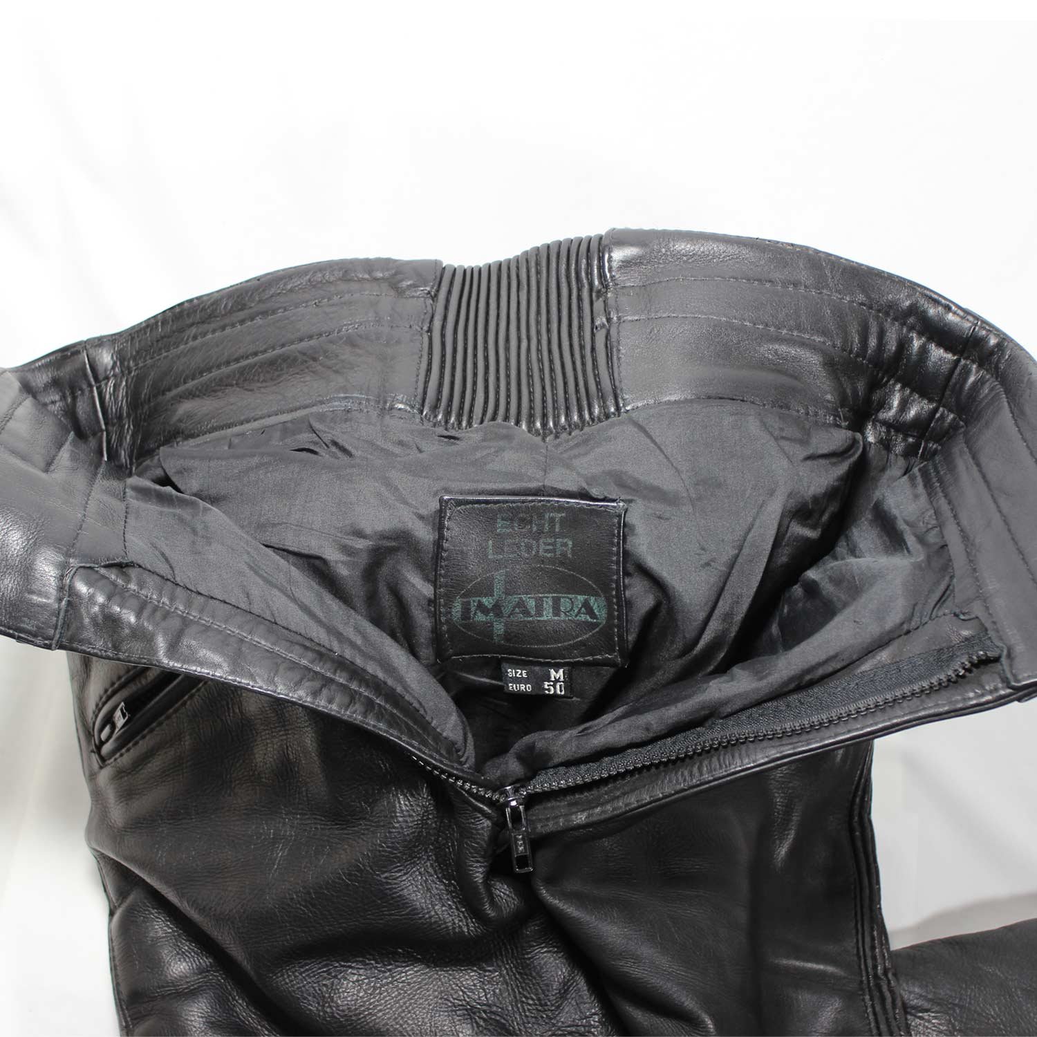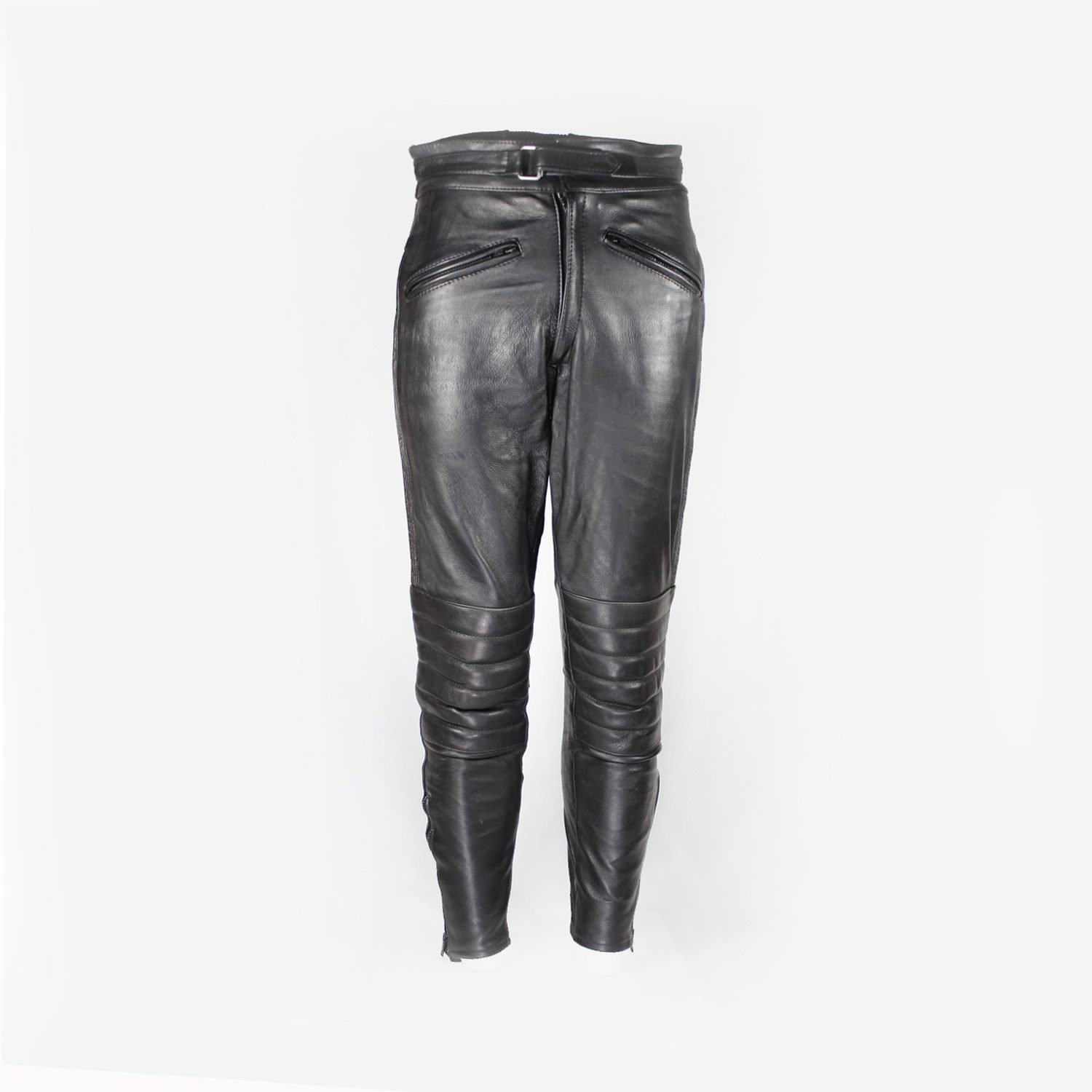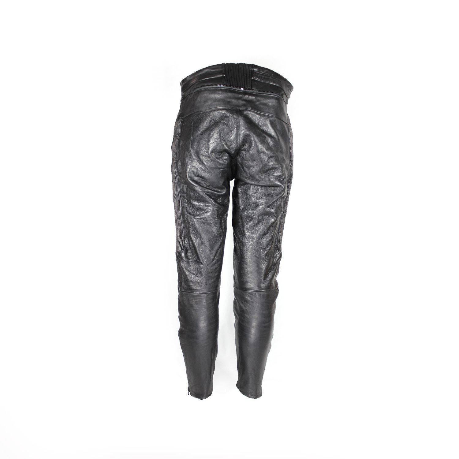 Vintage Café-racer pants in black leather is in good condition with minor wear. It features a stretch fit for comfort, soft knee padding, two pockets, and a short connecting zipper for riding jackets.