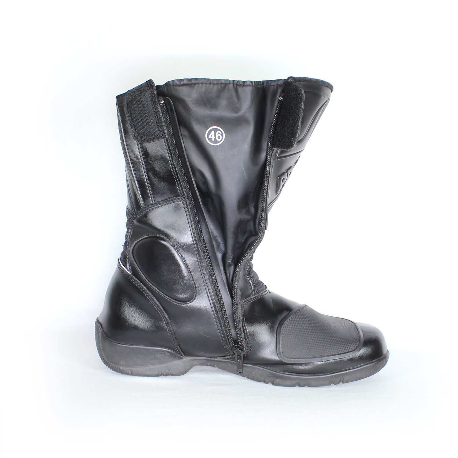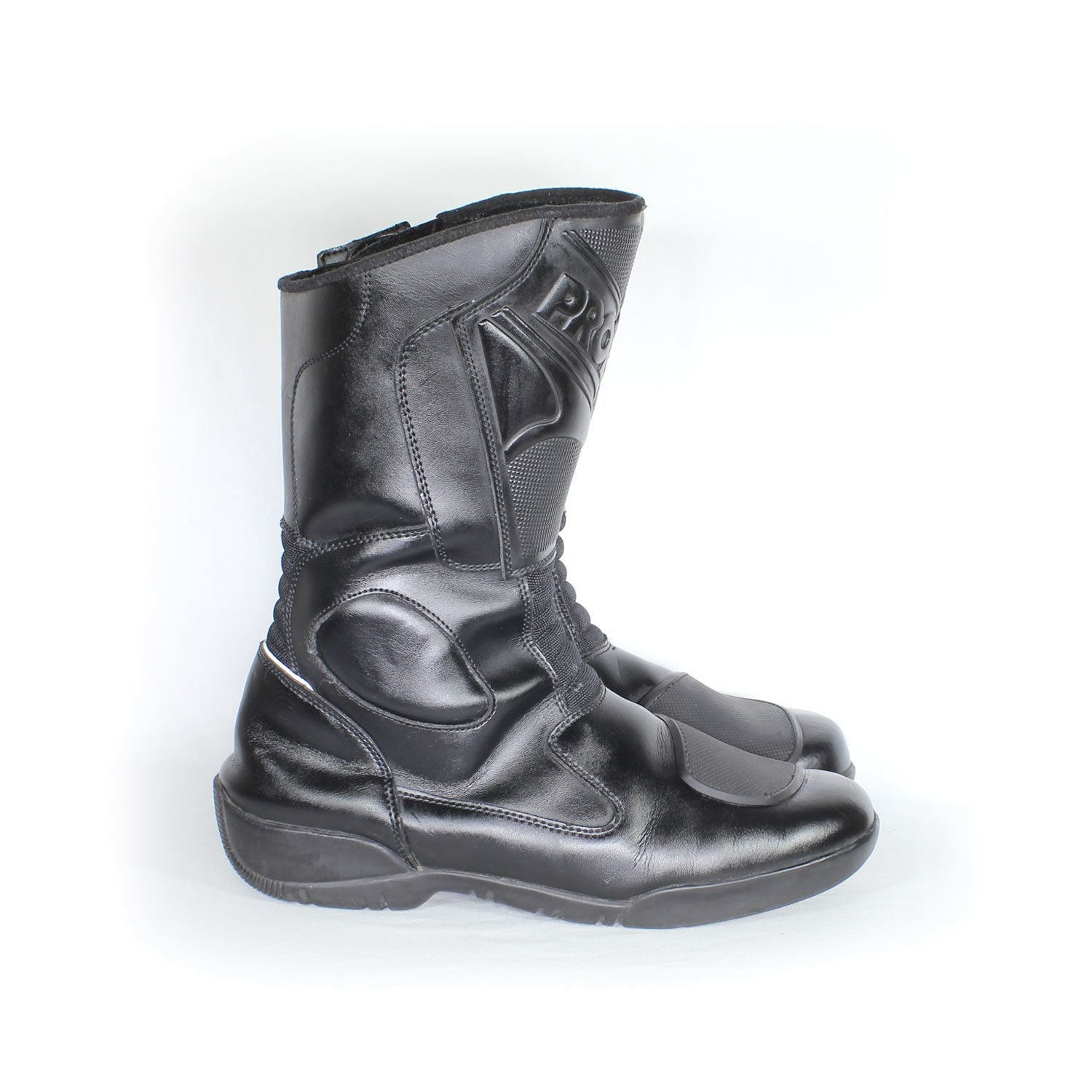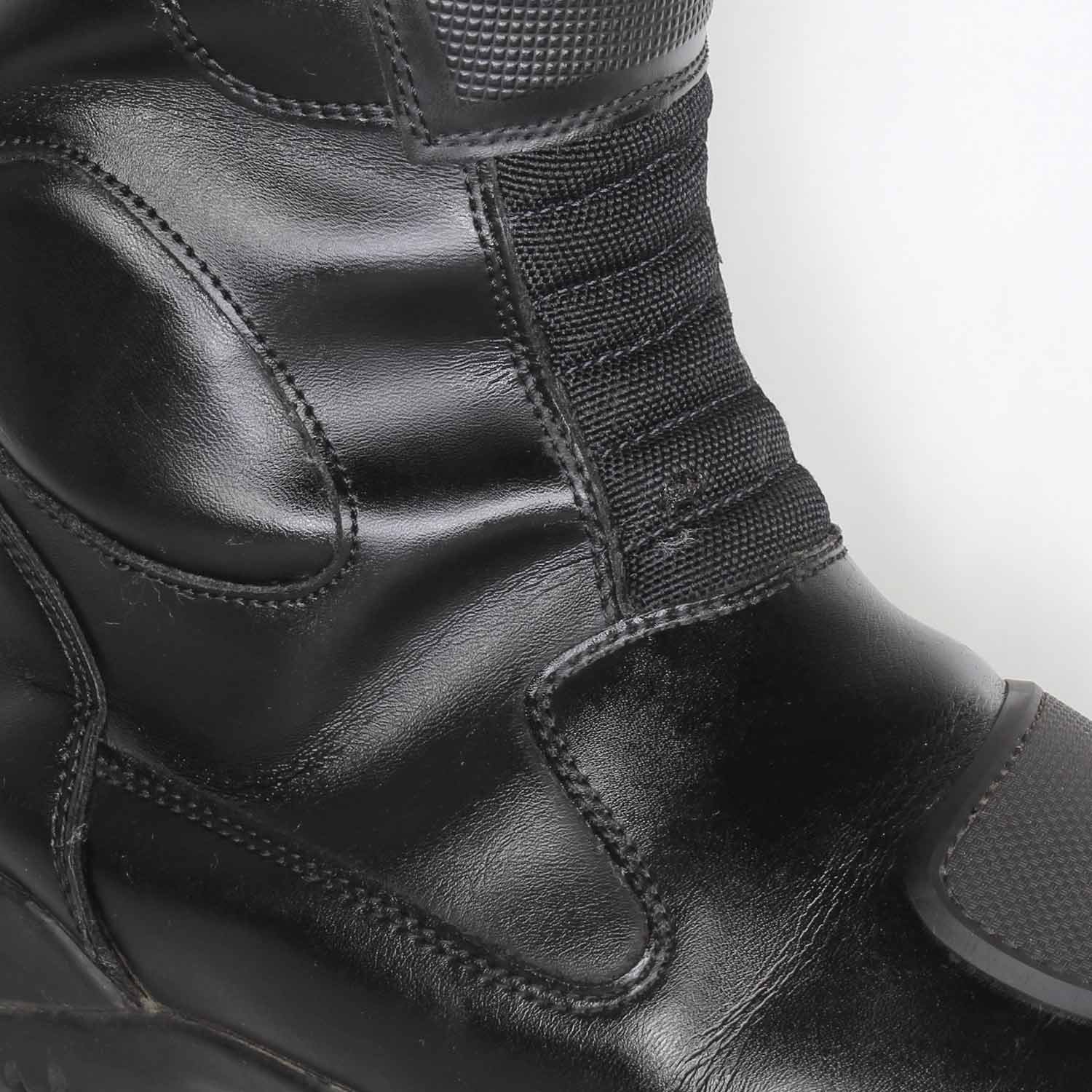 Touring black synthetic leather boots in fairly good condition. Designed for comfort and safety with reinforced toe, ankle, and gear protection. Offers partial waterproofing and reliable performance for every ride. A great choice for riders seeking durable, affordable touring boots with a classic look and proven functionality.
