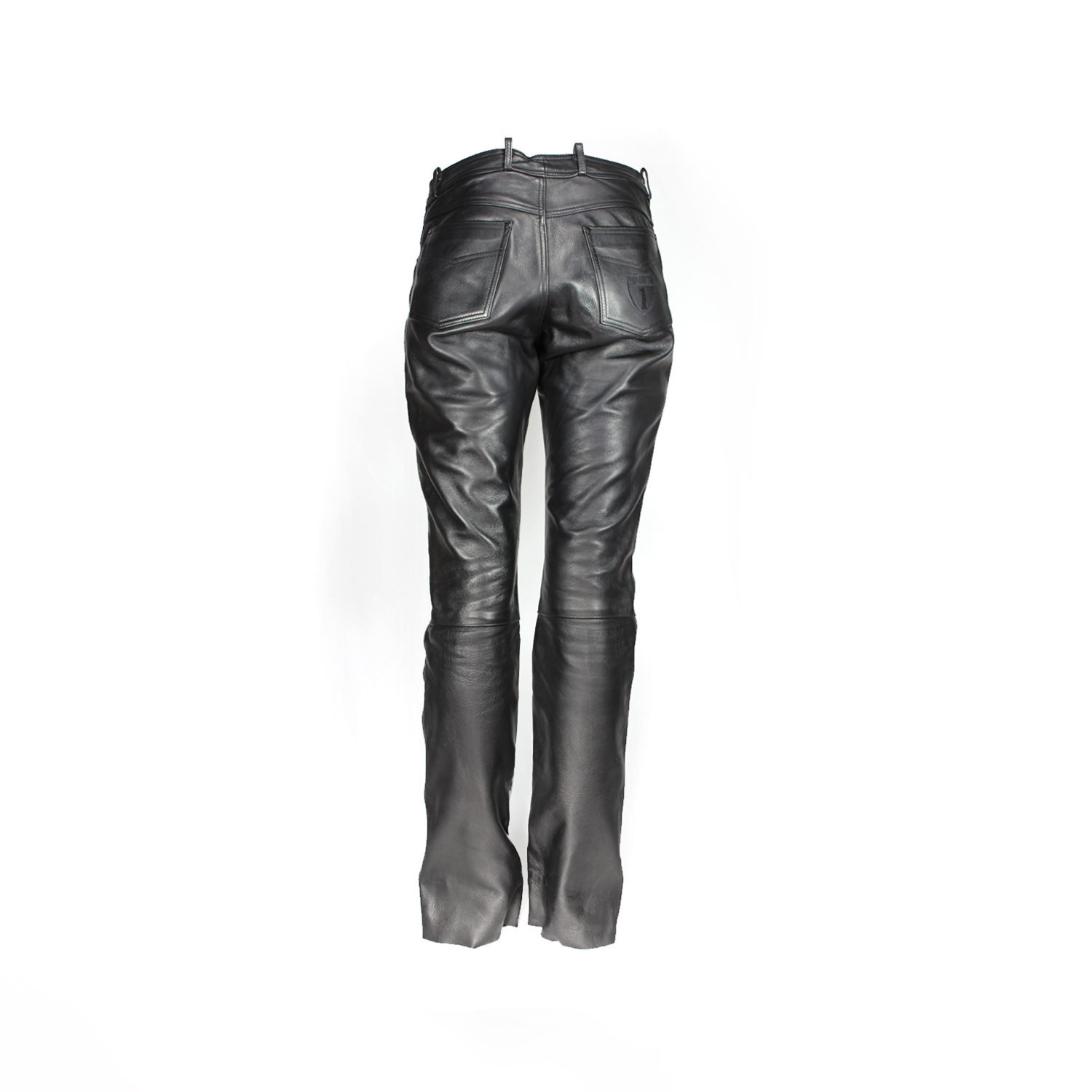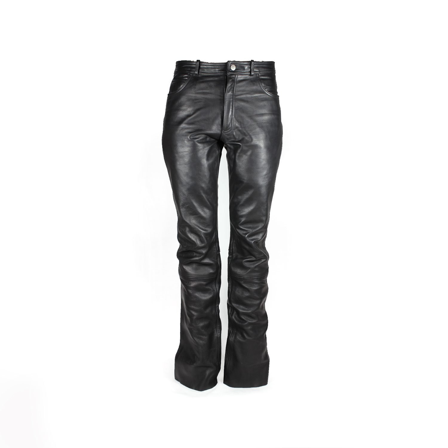 Vintage-style street/chopper pants with a classic five-pocket design. The black leather has a slight matte spot on one thigh.