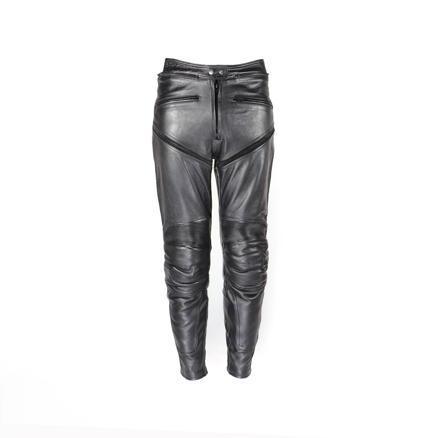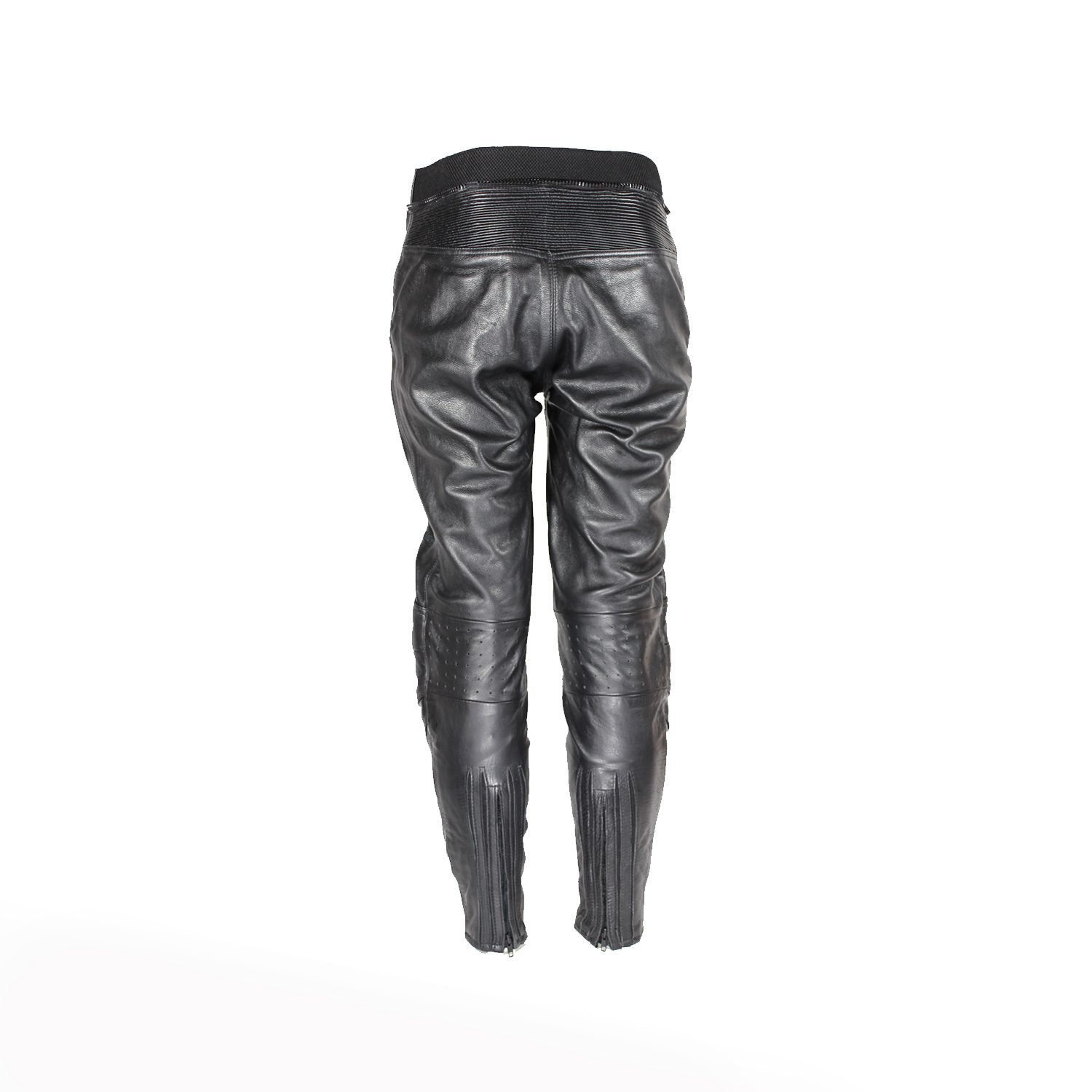 Women’s café-racer pants with perforated leather and foam knee/hip protection. Designed for a snug, comfortable fit with connection zippers.