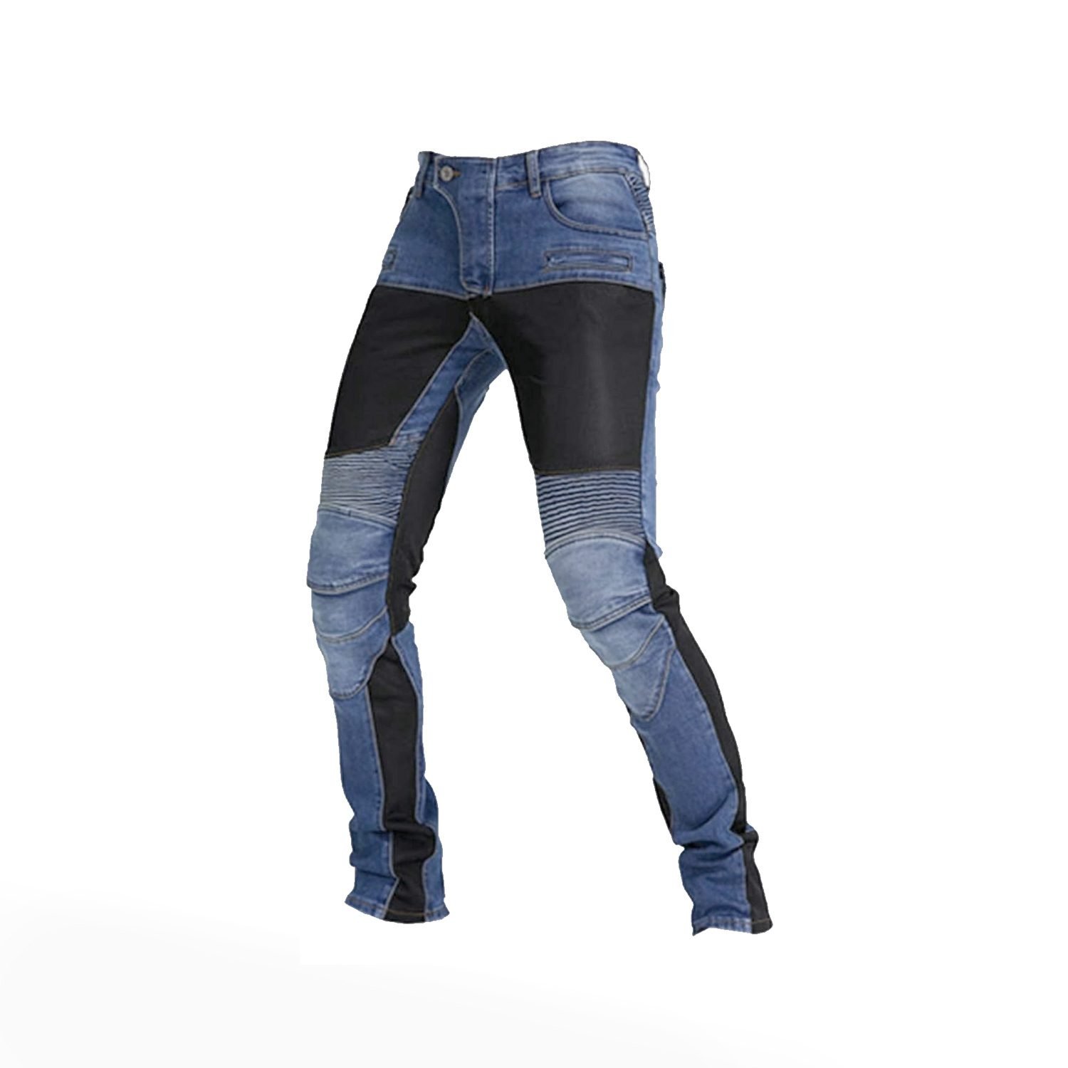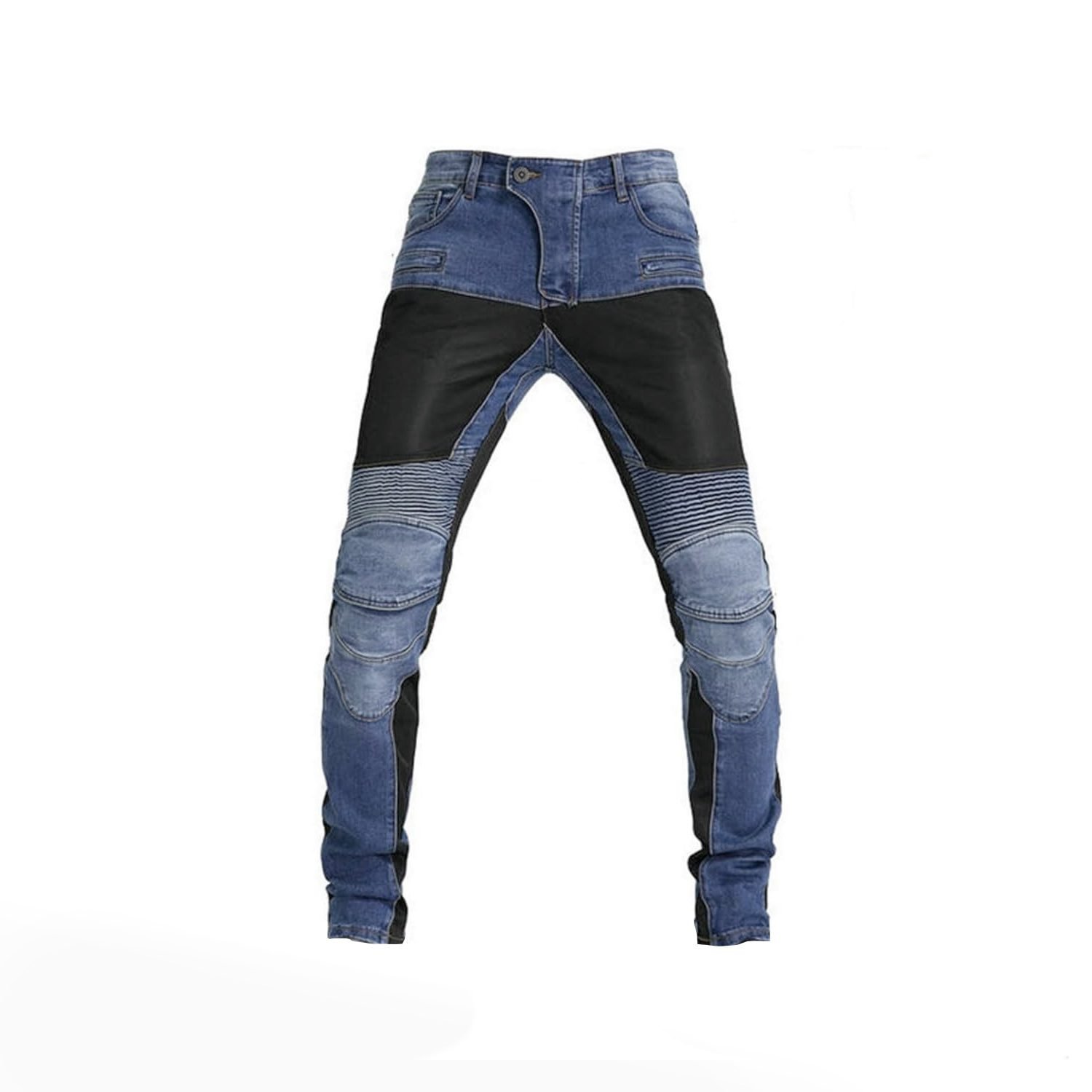 Men’s motorcycle jeans, available in Black & Blue Denim. Designed with spring and summer riding in mind, these jeans combine a denim outer with a breathable polyester mesh lining that actively promotes air circulation — keeping you cool on longer rides without sacrificing style off the bike.