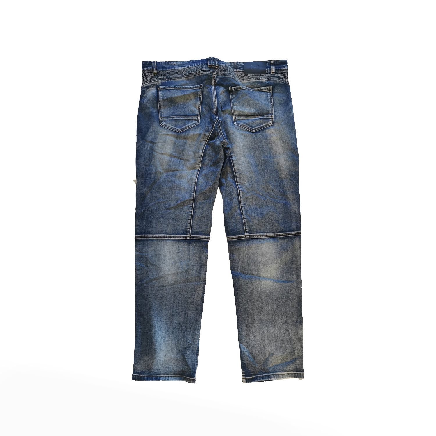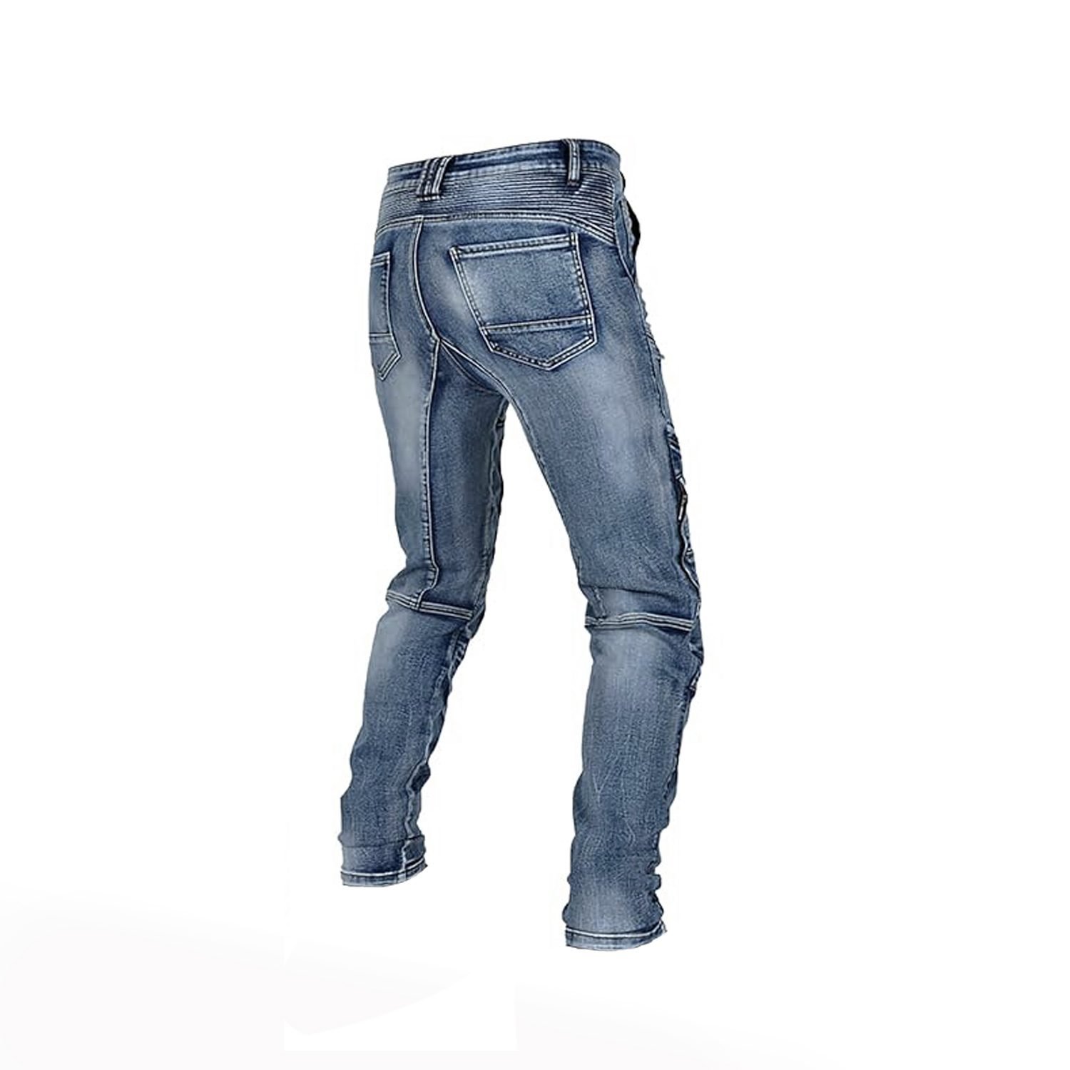 Men’s motorcycle riding jeans in Denim Blue. Crafted from a cotton, polyester and spandex blend, these jeans offer a comfortable, flexible fit suited for both daily wear and riding. The stretch shirring panels above the knee and at the waist-back ensure unrestricted movement, whether you’re in the saddle or off the bike.