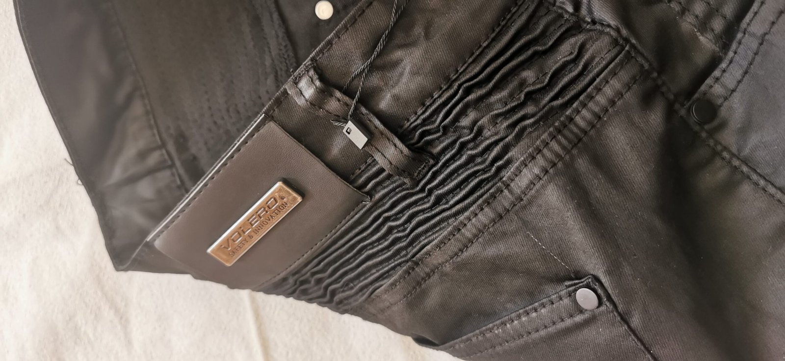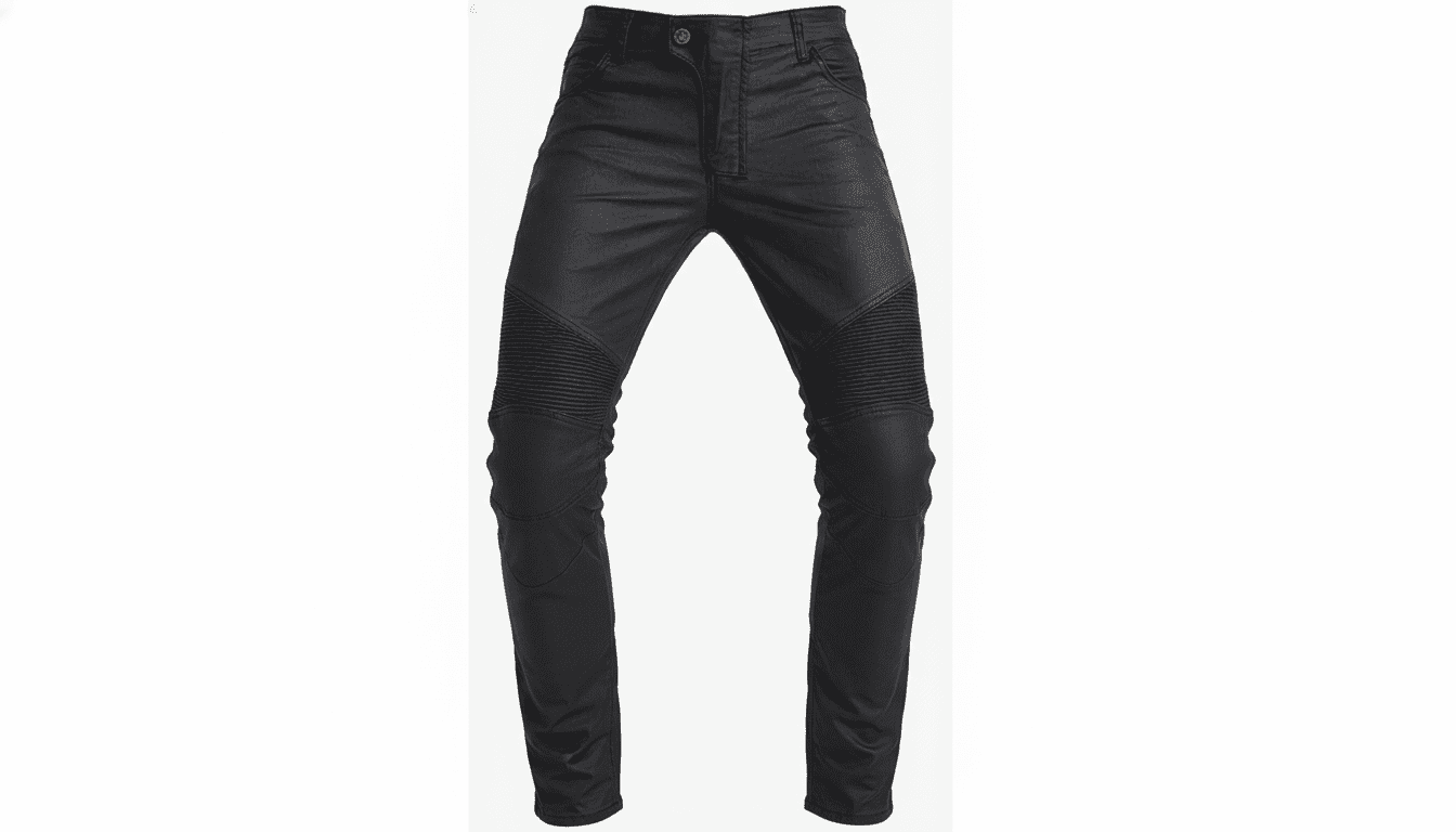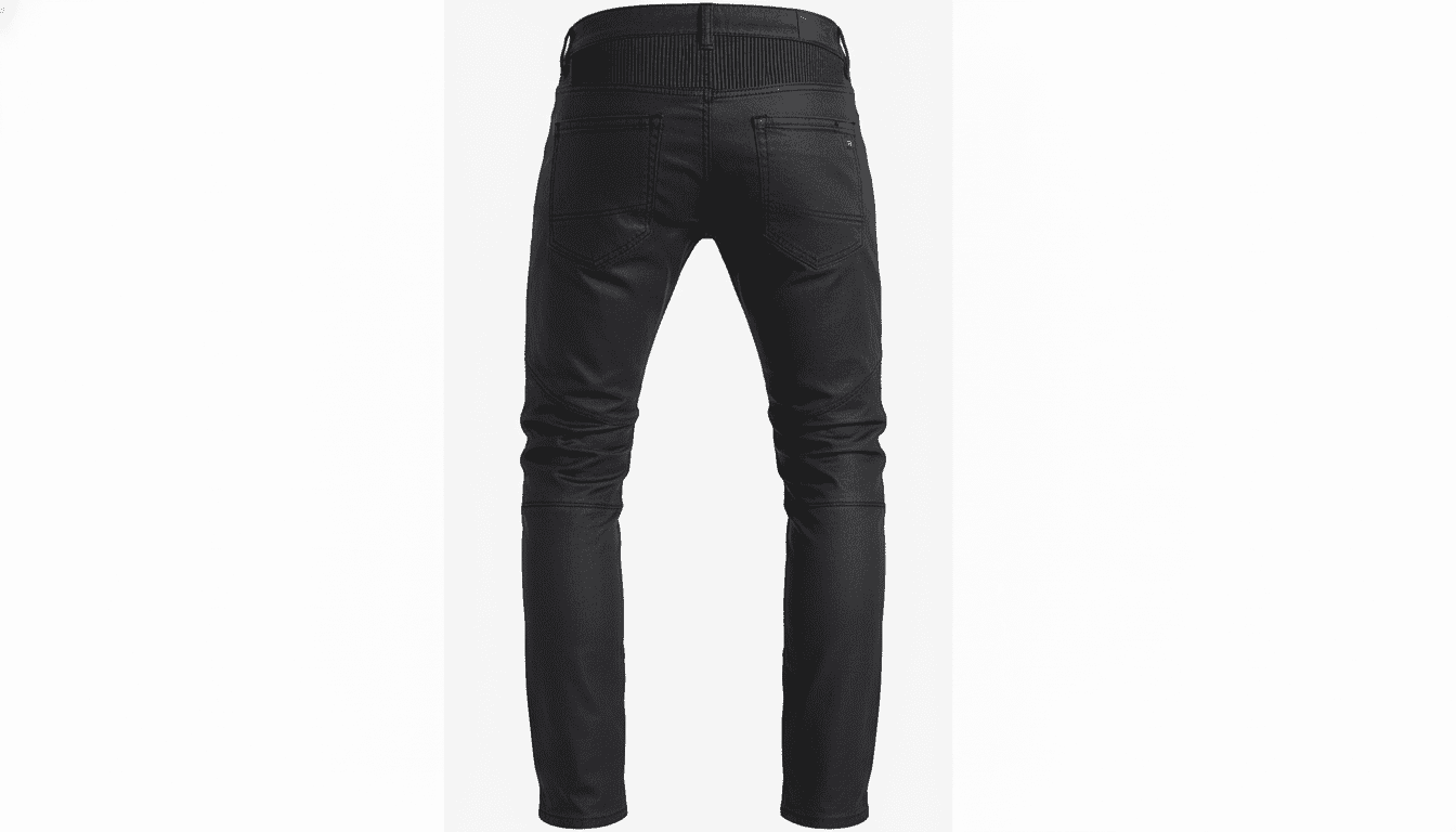 Men’s motorcycle riding jeans in Black. These casual-style riding jeans are crafted from 12oz stretch denim (97% Cotton, 3% Spandex), making them equally suited for daily wear and riding. The stretch shirring panels above the knee and at the waist-back ensure unrestricted movement, while the ergonomic knee and back waist folding design offers enhanced flexibility on the bike.